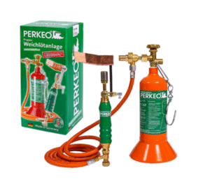De PERKEO soldeerset bestaat uit een karweifles, drukregelaar, slang en handvat (exclusief soldeerbout en windkap).