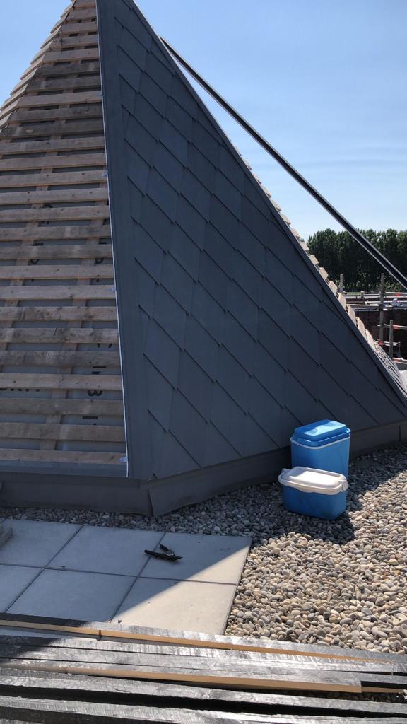 Brouwers Zink & Dak heeft de ruitvormige losanges prefab mogen aanleveren voor dit mooie werk. De felsbanen en roefbanen zijn dit keer niet door Brouwers Zink & Dak geleverd.