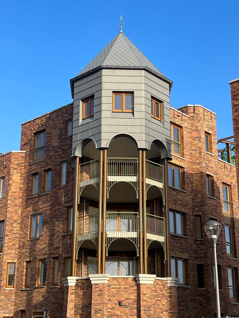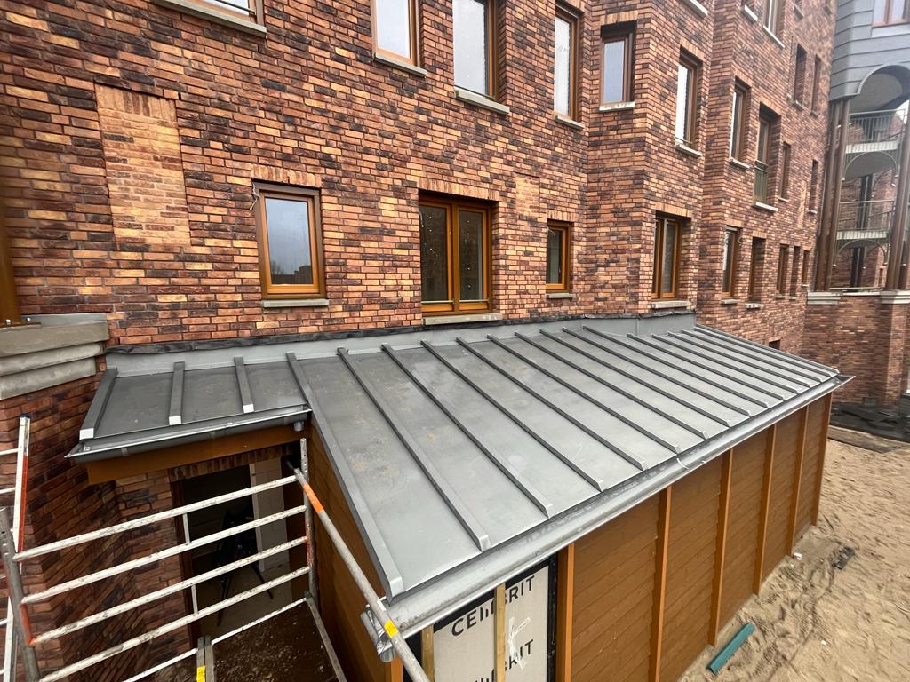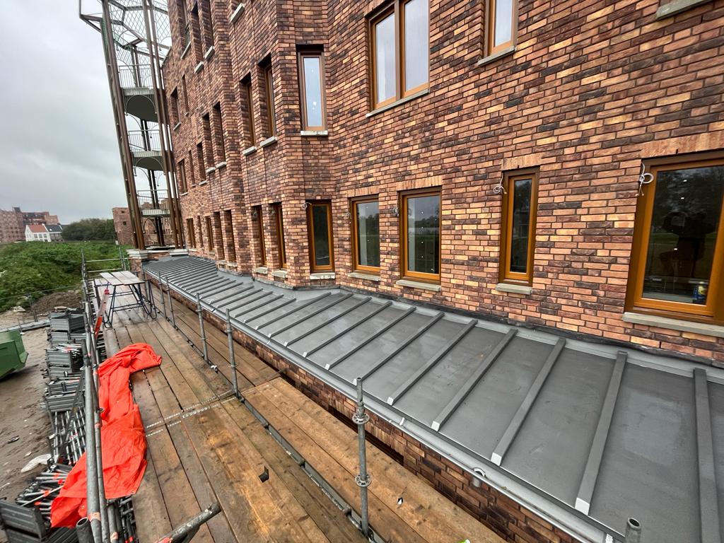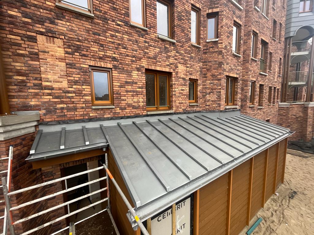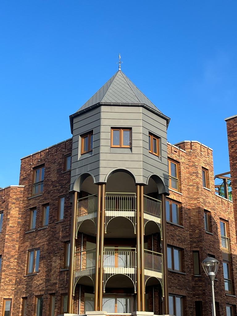 Dit project omvat drie hoofddisciplines in het zink- en felswerk: felsbanen, roefbanen en losanges. De toren van het gebouw is bekleed met kenmerkende ruitvormige losanges uitgevoerd in VM Quartz Plus. Dit soort losanges worden vaker toegepast als dak- en/of gevelbekleding. Vakmanschap en zorgvuldige installatie van deze zinken elementen zijn essentieel om een waterdichte en duurzame afwerking te garanderen. Verder zijn er horizontale zinken felsbanen aangebracht onder de toren, wat een prachtig aanzicht oplevert. De lager gelegen daken zijn uitgevoerd in zinken roefbanen.